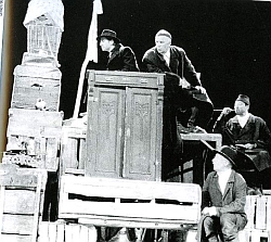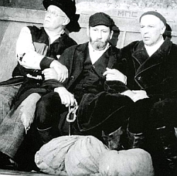 Марина Тимашева: Когда эта четверка спутников выстраивается на авансцене по росту, все - в темных пальто и сношенной грубой обуви, когда они закладывают за согбенные спины одну, и потом вторую руку, когда они, дождавшись первых тактов музыки, начинают медленно и степенно переваливаться с ноги на ногу, намекая на ход еврейского танца, но совершенно его не акцентируя, люди в зале рыдают в голос. И ждут этого прохода-рефрена, как минуты свидания с настоящим театром.